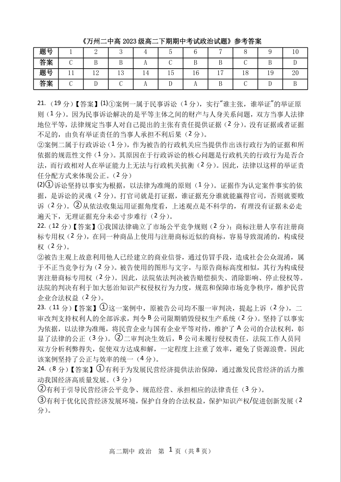 重庆市万州二中2024-2025学年下学期高二期中考试政治答案