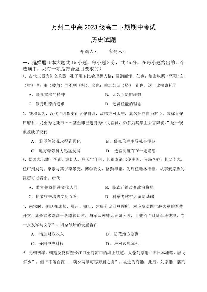 重庆市万州二中2024-2025学年下学期高二期中考试历史