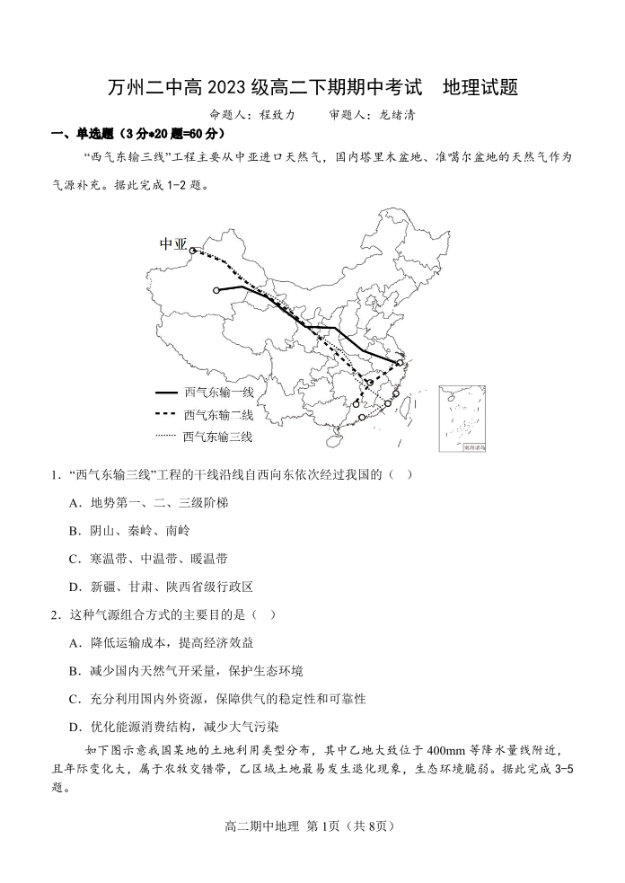 重庆市万州二中2024-2025学年下学期高二期中考试地理