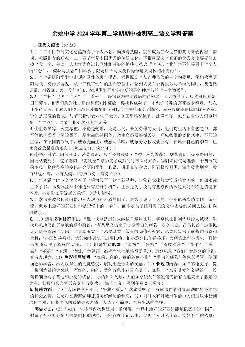浙江省余姚中学2024-2025学年下学期高二期中考试语文答案