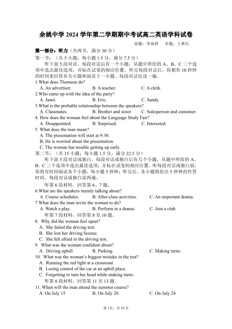 浙江省余姚中学2024-2025学年下学期高二期中考试英语