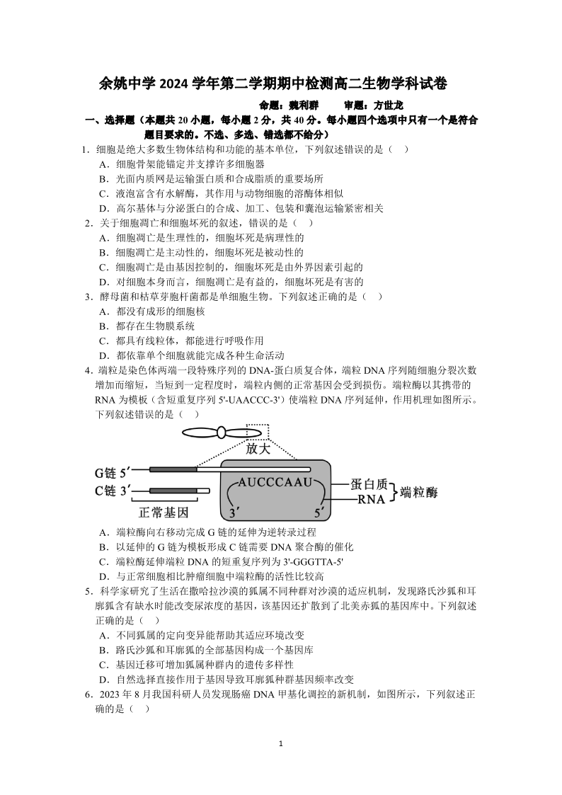 浙江省余姚中学2024-2025学年下学期高二期中考试生物