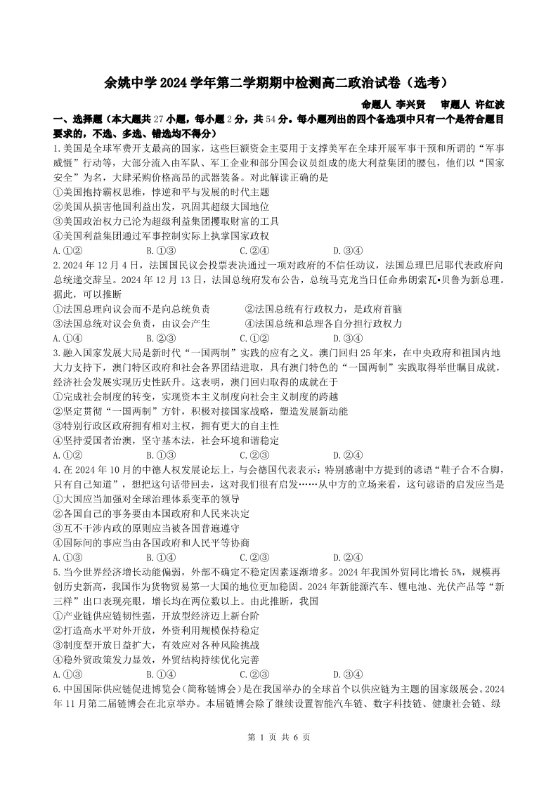 浙江省余姚中学2024-2025学年下学期高二期中考试政治