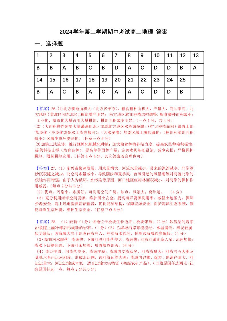 浙江省余姚中学2024-2025学年下学期高二期中考试地理答案
