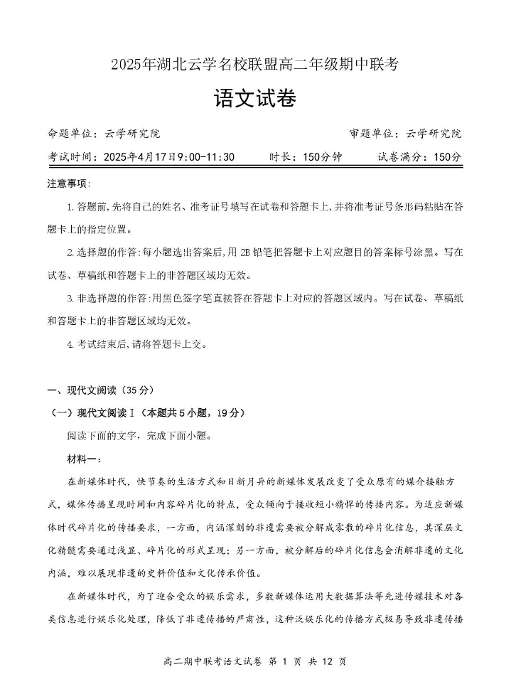 湖北省云学名校联盟2024-2025学年下学期4月高二期中联考语文