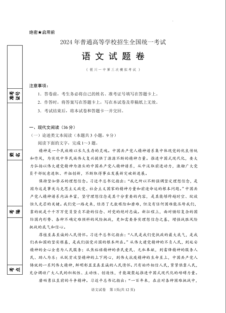 宁夏回族自治区银川一中2024届高三下学期第三次模拟考试语文