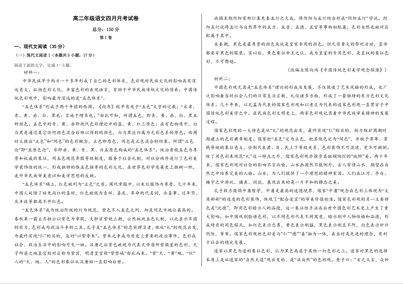 河北省张家口市一中2024-2025学年下学期4月高二月考试题语文+答案