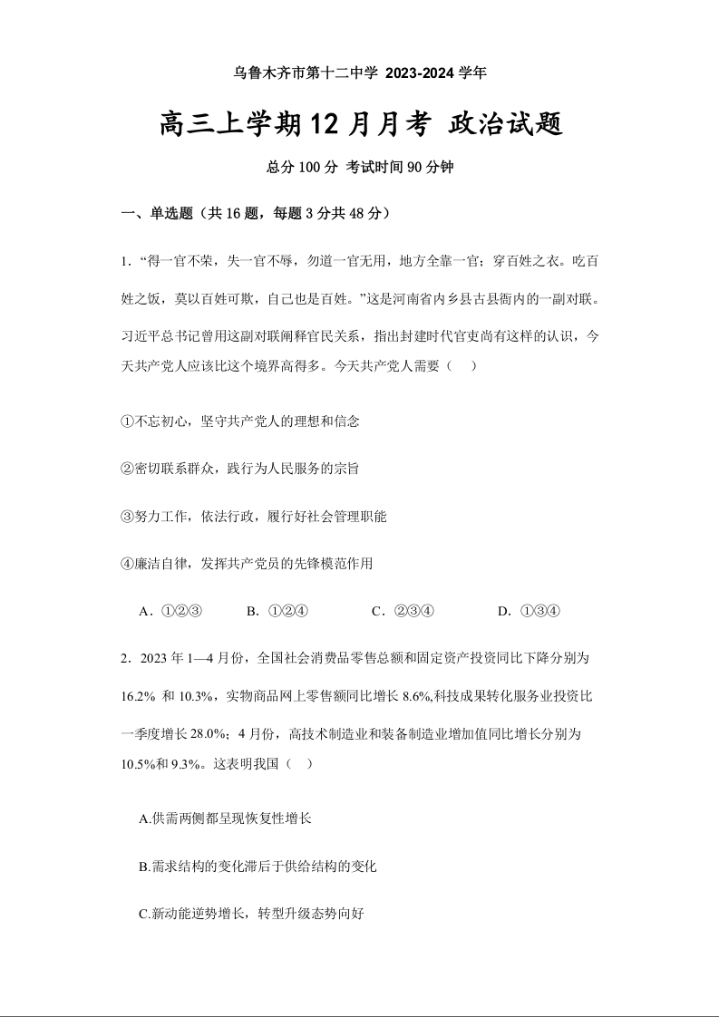 新疆乌鲁木齐市第十二中学2024届高三上学期12月月考政治+答案