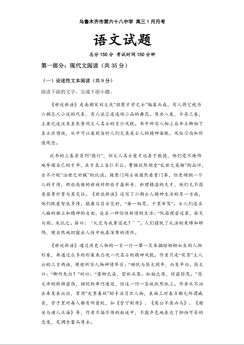 新疆乌鲁木齐市第六十八中学2024届高三上学期1月月考语文+答案