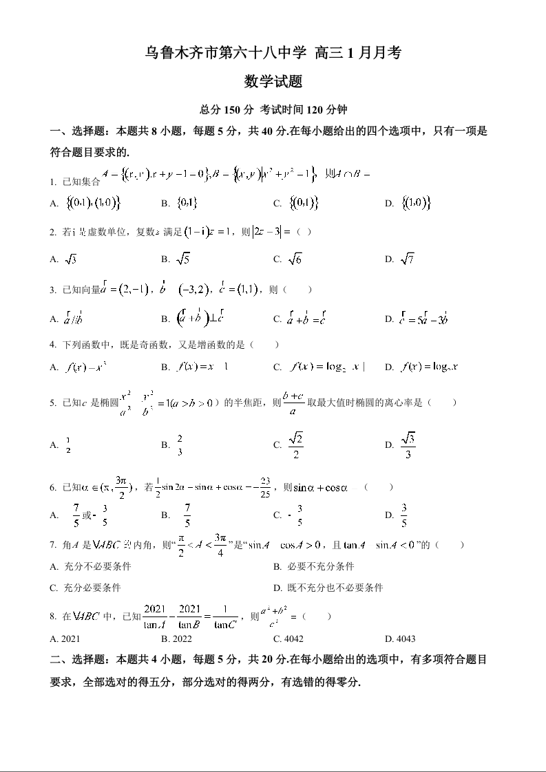 新疆乌鲁木齐市第六十八中学2024届高三上学期1月月考数学+答案