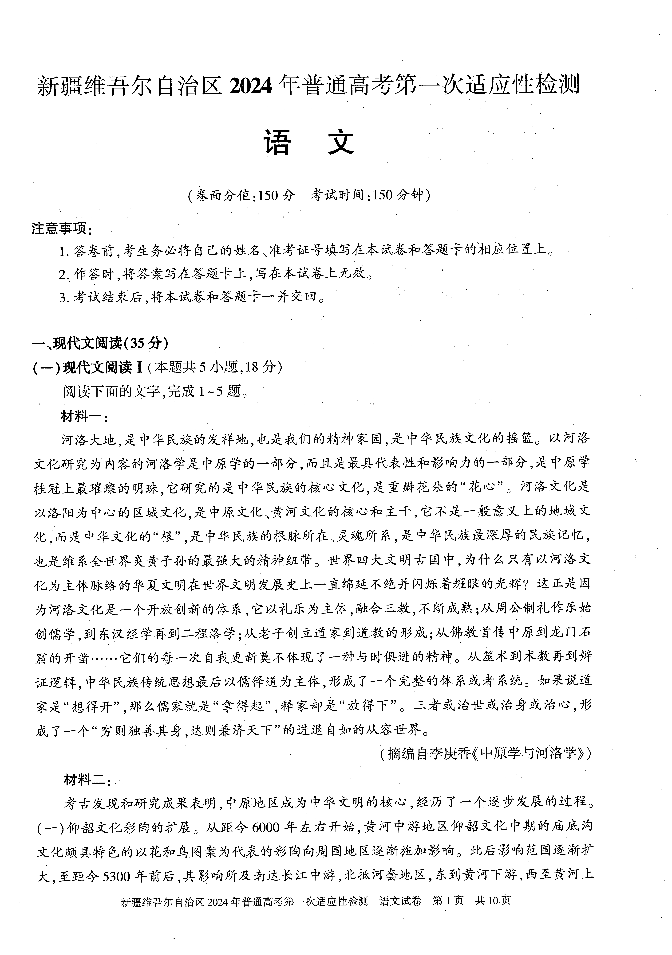 新疆区域高中2024届高三下学期第一次适应性检测语文