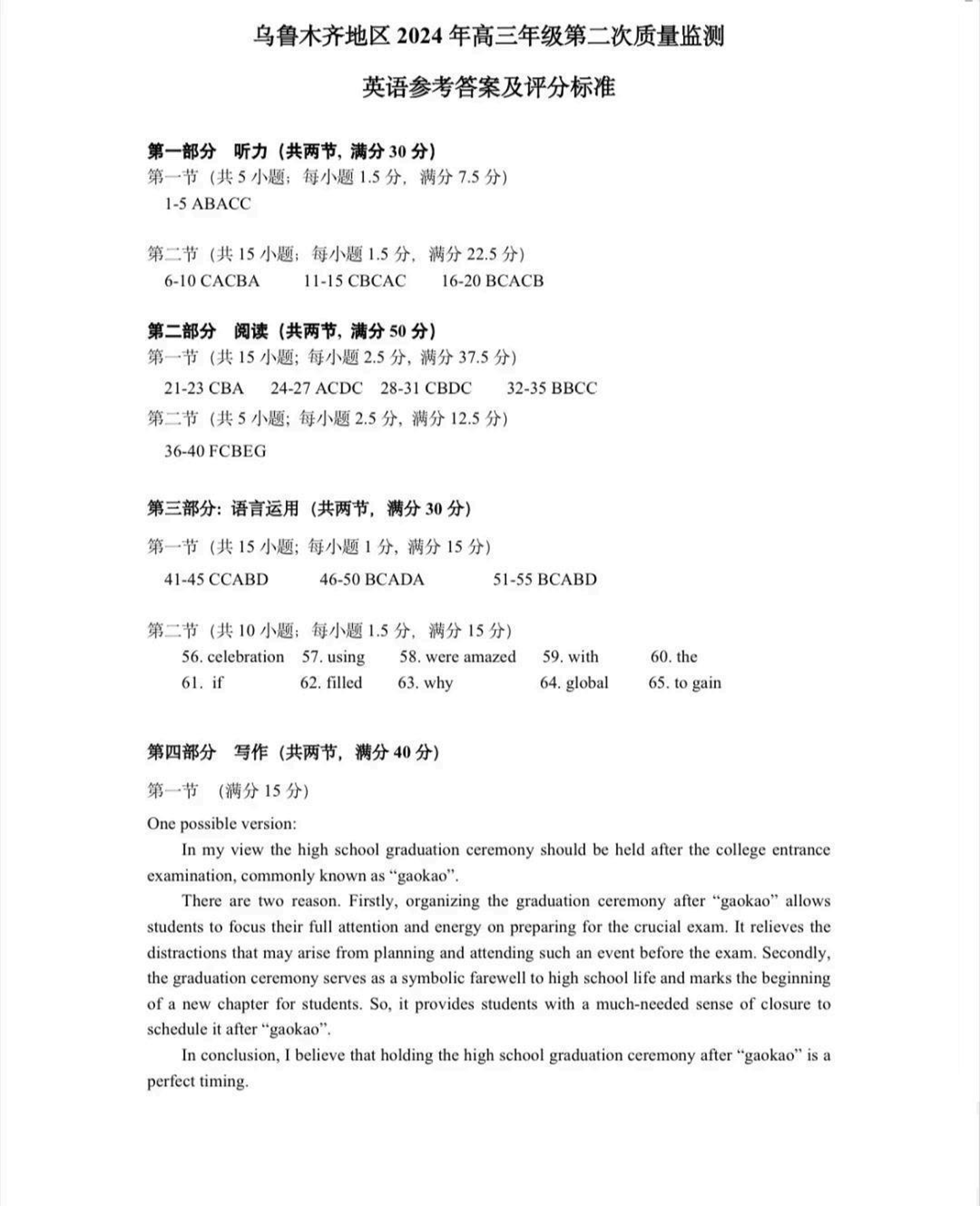 新疆乌鲁木齐地区高三下学期第二次质量监测(新疆二模)英语答案