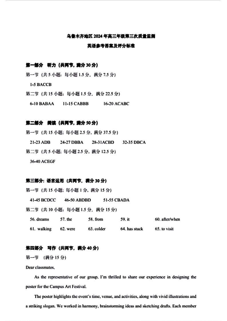 新疆乌鲁木齐地区2024届高三下学期第三次质量(三模)英语答案