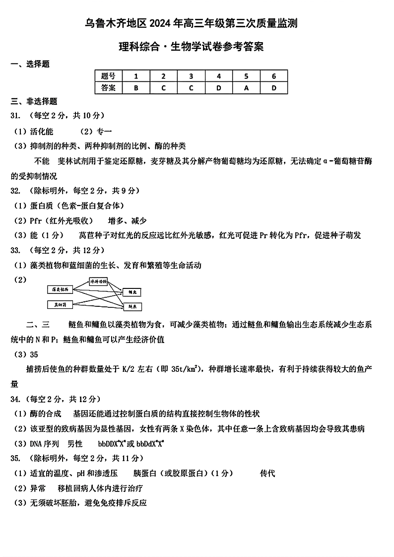 新疆乌鲁木齐地区2024届高三下学期第三次质量(三模)理科综合答案