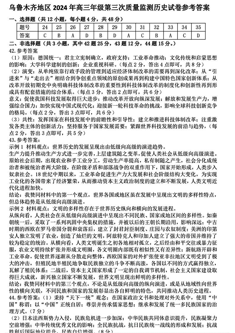 新疆乌鲁木齐地区2024届高三下学期第三次质量(三模)文科综合答案
