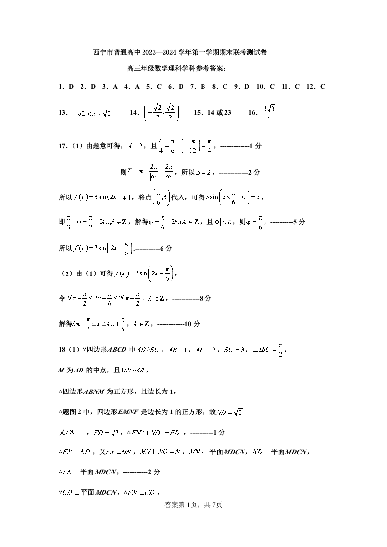 青海省西宁市2024届高三上学期期末联考理科数学答案