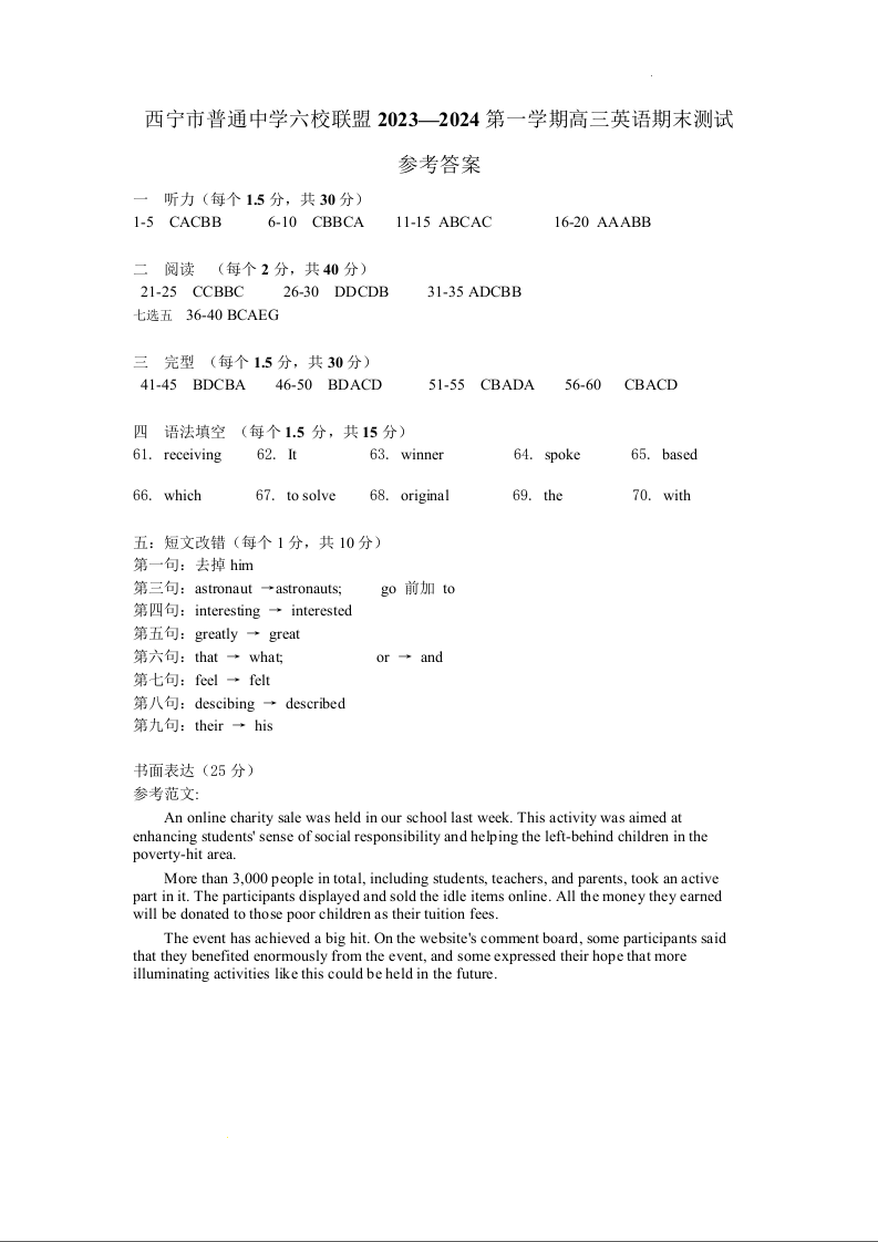 青海省西宁市2024届高三上学期期末联考英语答案