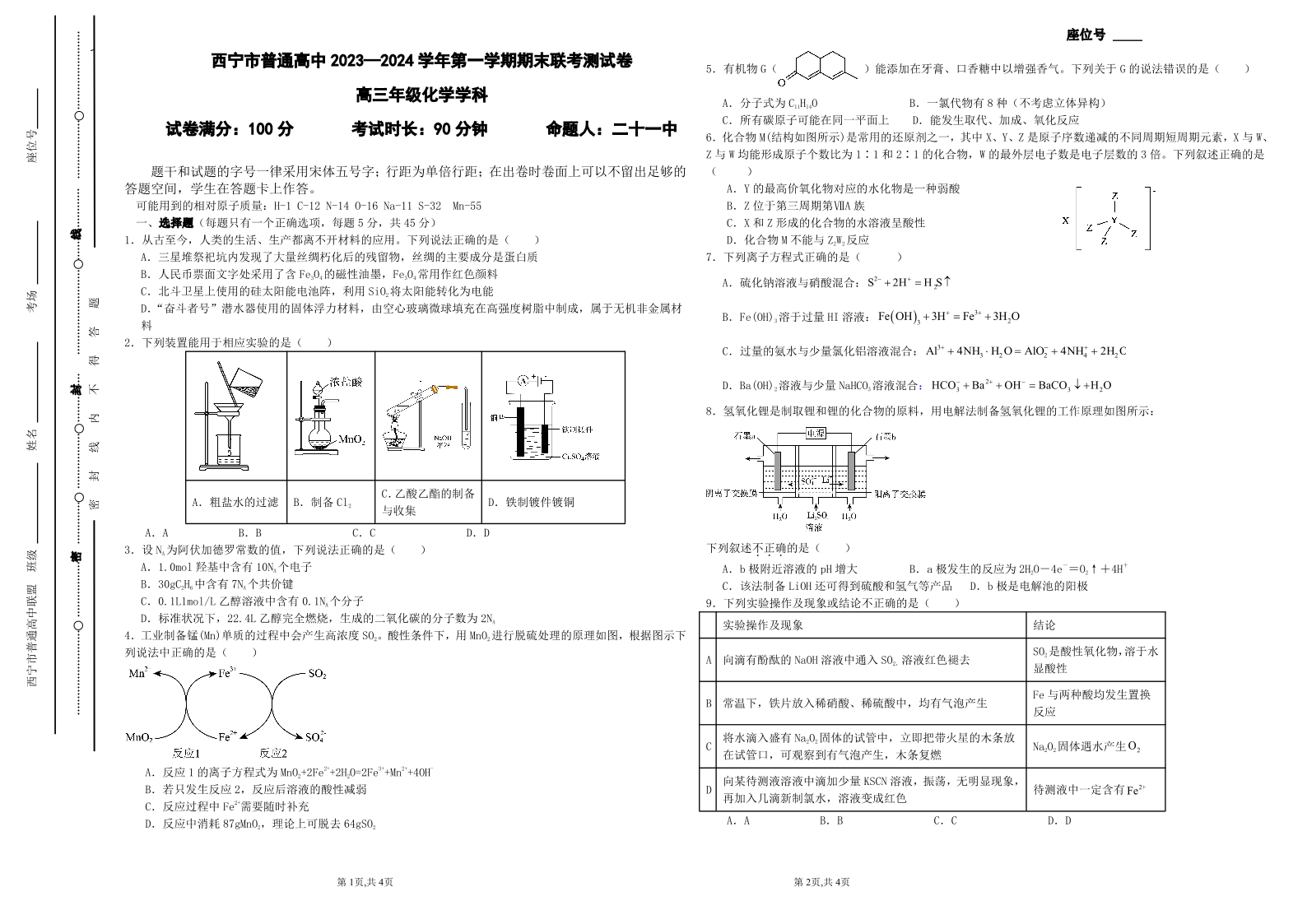 青海省西宁市2024届高三上学期期末联考化学