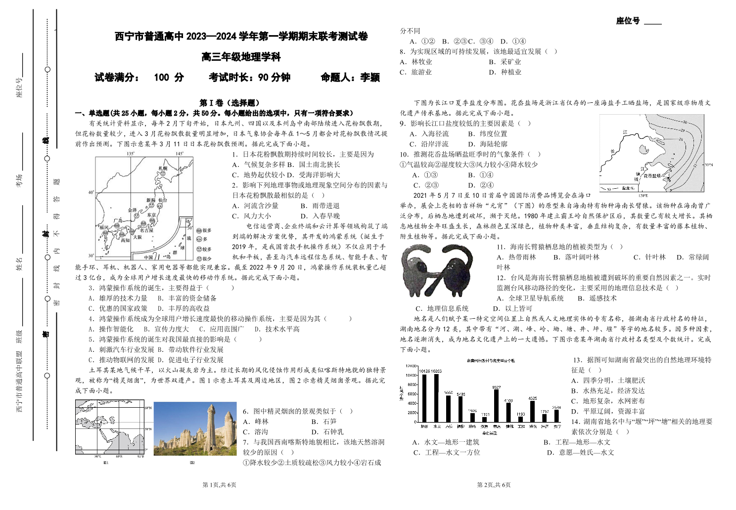 青海省西宁市2024届高三上学期期末联考地理