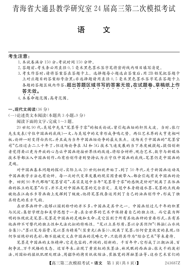 青海省西宁市大通县2024届高三第二次模拟考试语文