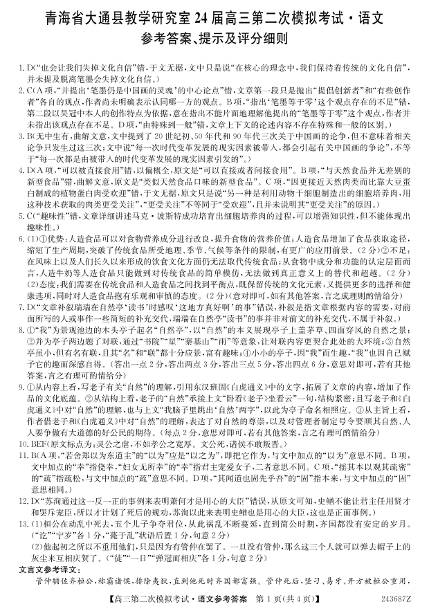 青海省西宁市大通县2024届高三第二次模拟考试语文答案