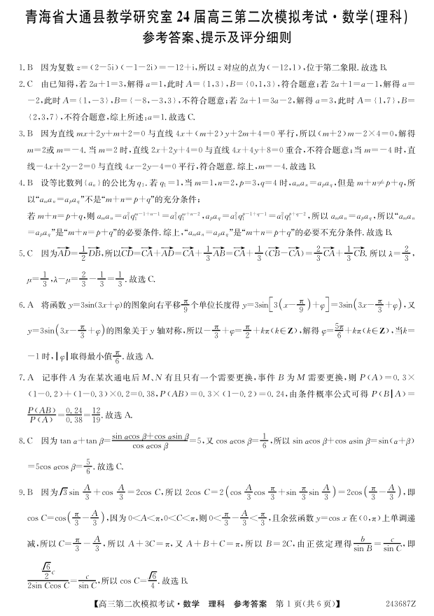 青海省西宁市大通县2024届高三第二次模拟考试理数答案