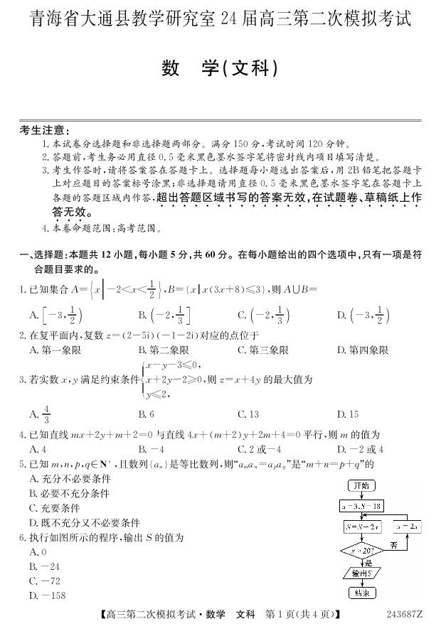 青海省西宁市大通县2024届高三第二次模拟考试文数