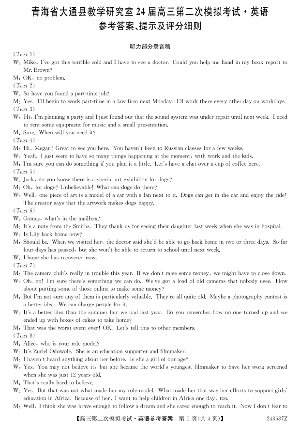 青海省西宁市大通县2024届高三第二次模拟考试英语答案