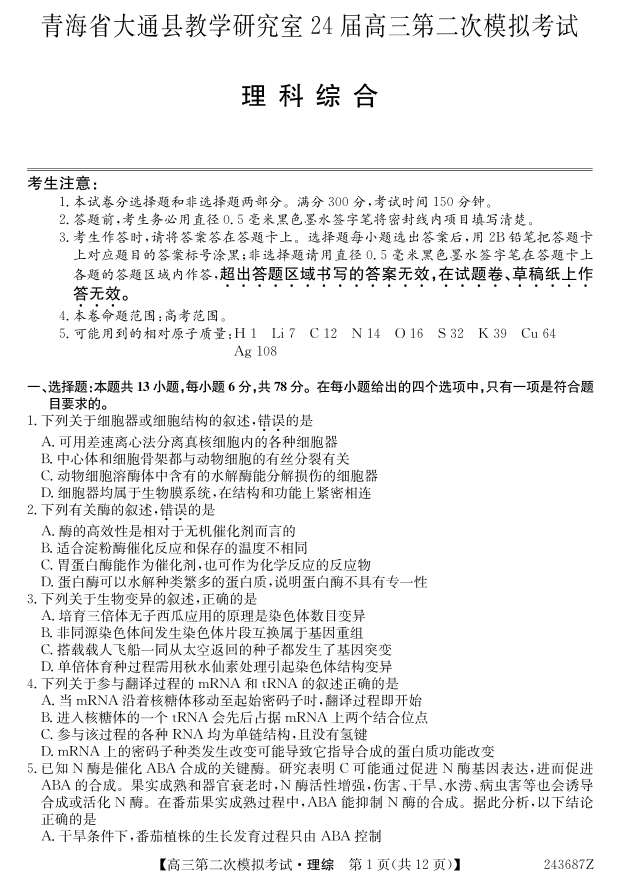 青海省西宁市大通县2024届高三第二次模拟考试理综