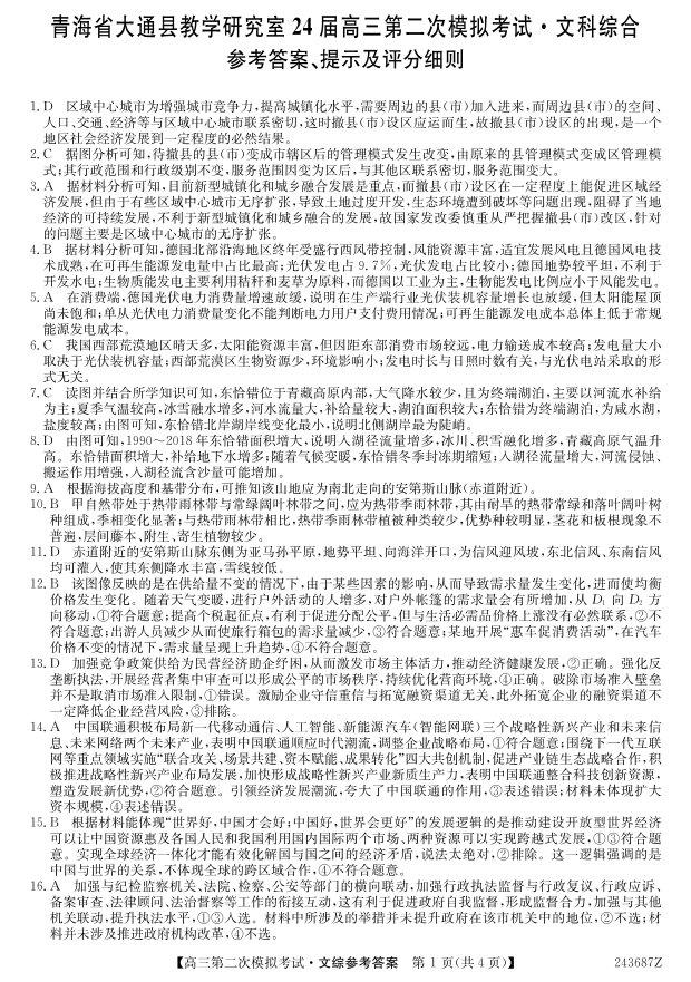 青海省西宁市大通县2024届高三第二次模拟考试文综答案