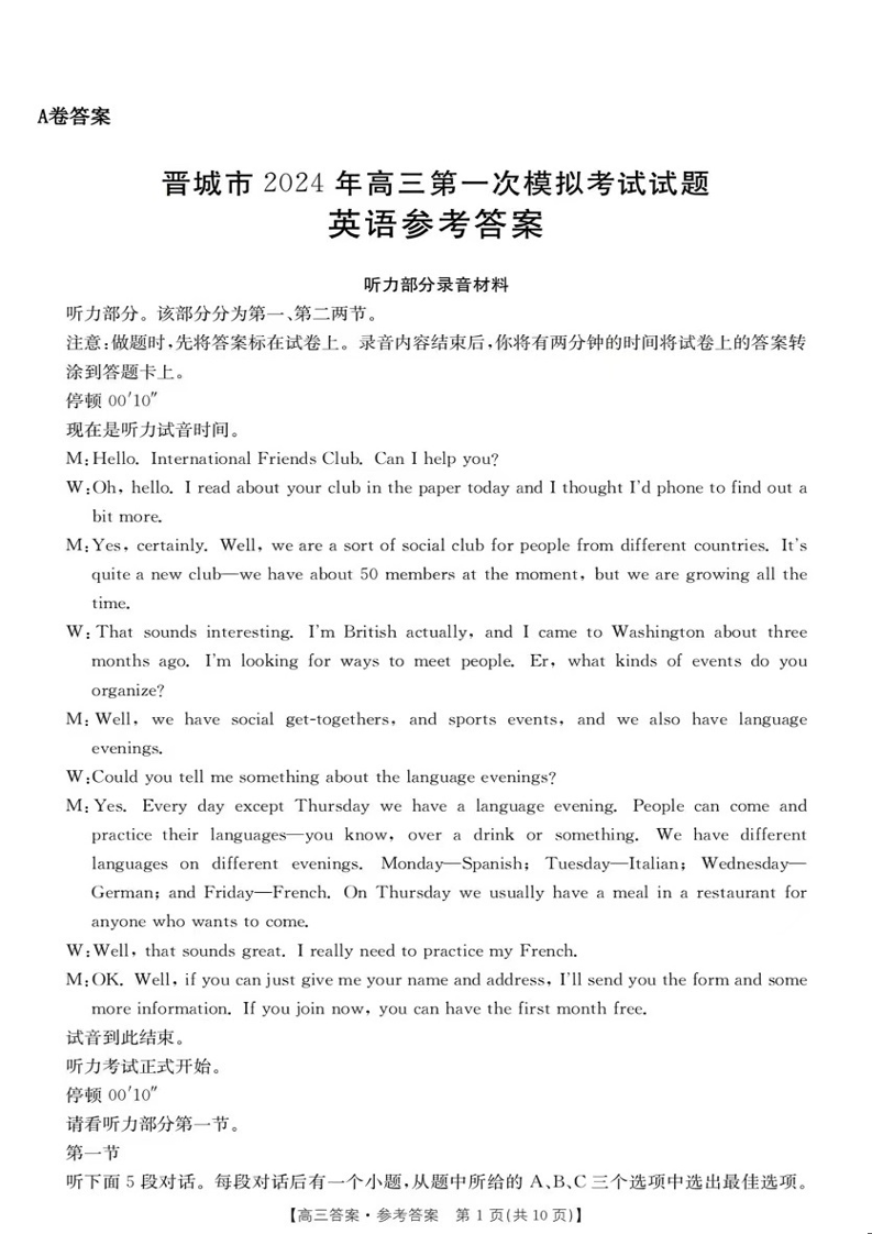 山西省晋城市2024届高三上学期第一次模拟考试(296C)英语答案