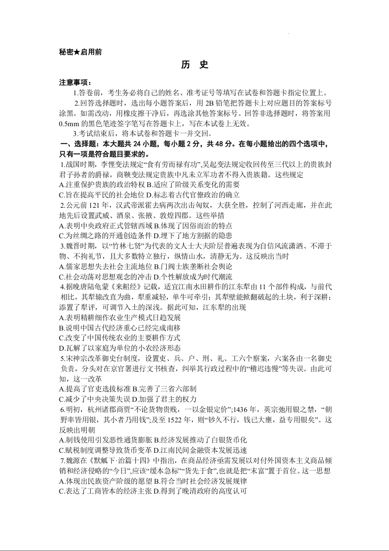 山西省大同市2024届高三上学期冬季教学质量检测历史