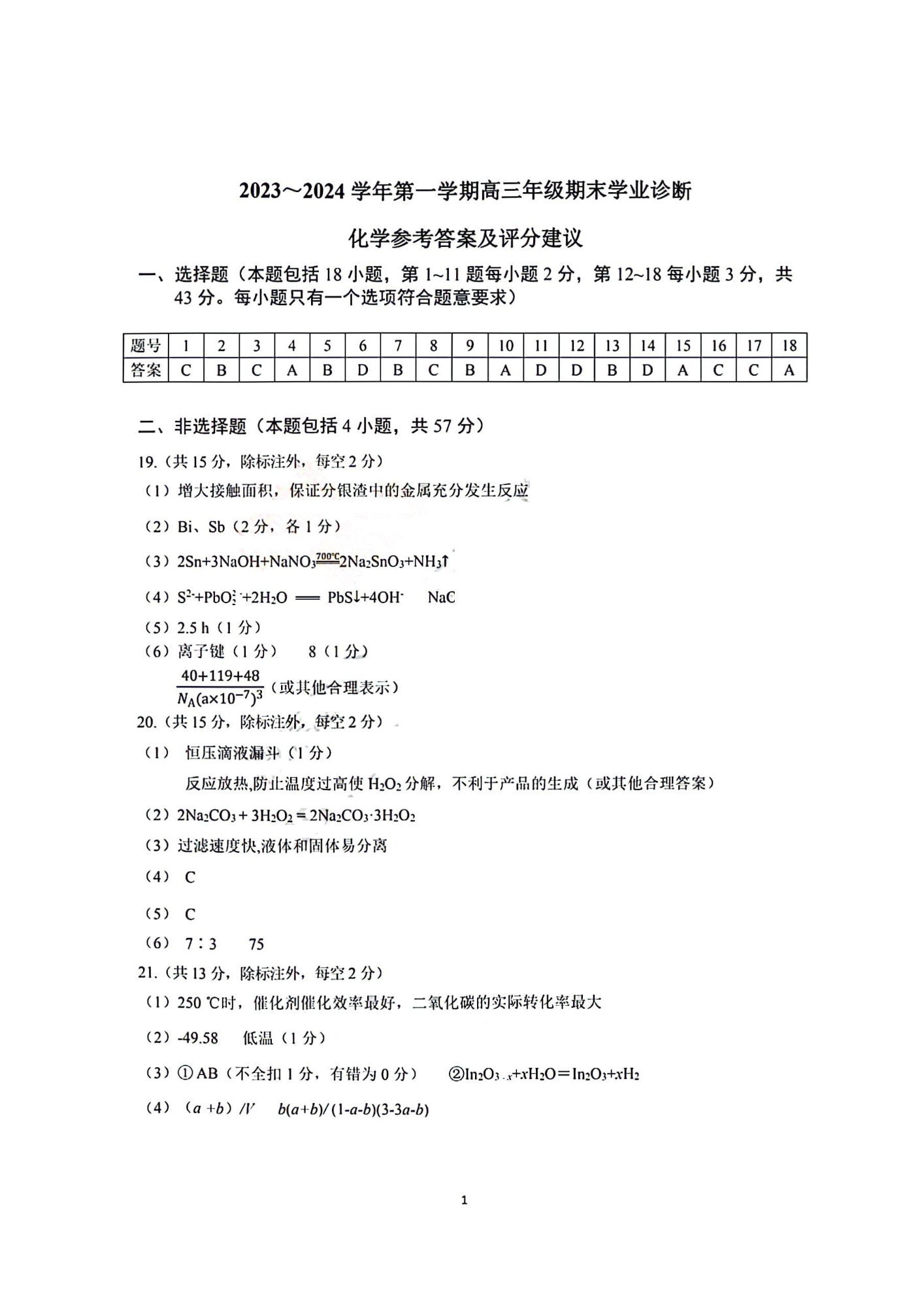 山西省太原市2024届高三上学期期末学业诊断化学答案