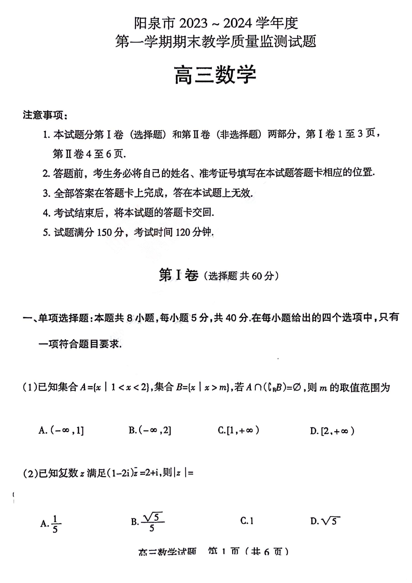 山西省阳泉市2024届高三年级上学期期末考试数学