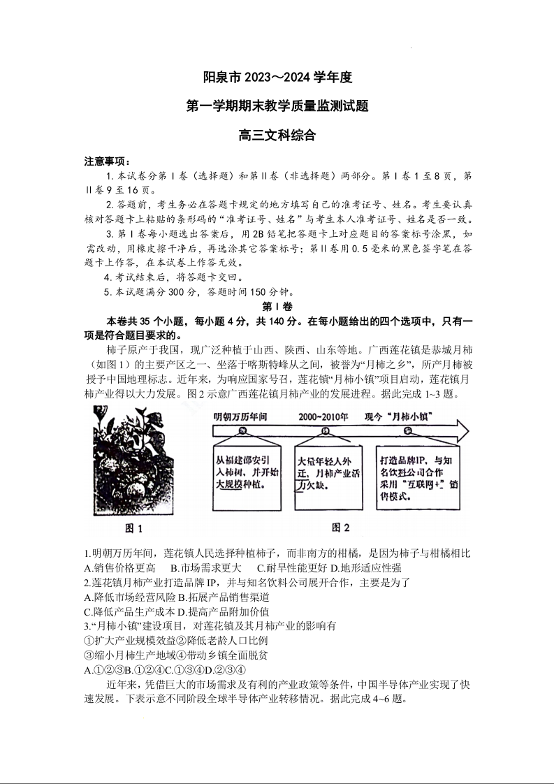 山西省阳泉市2024届高三年级上学期期末考试文综+答案
