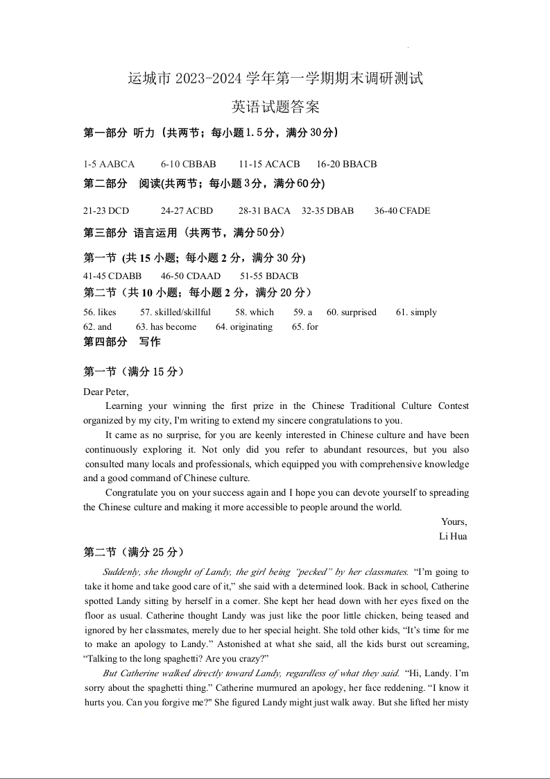 山西省运城市2024届高三上学期期末调研测试英语答案