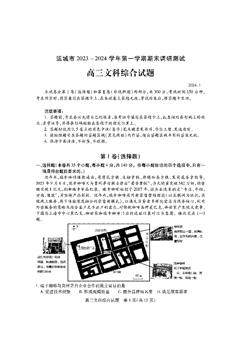 山西省运城市2024届高三上学期期末调研测试文综