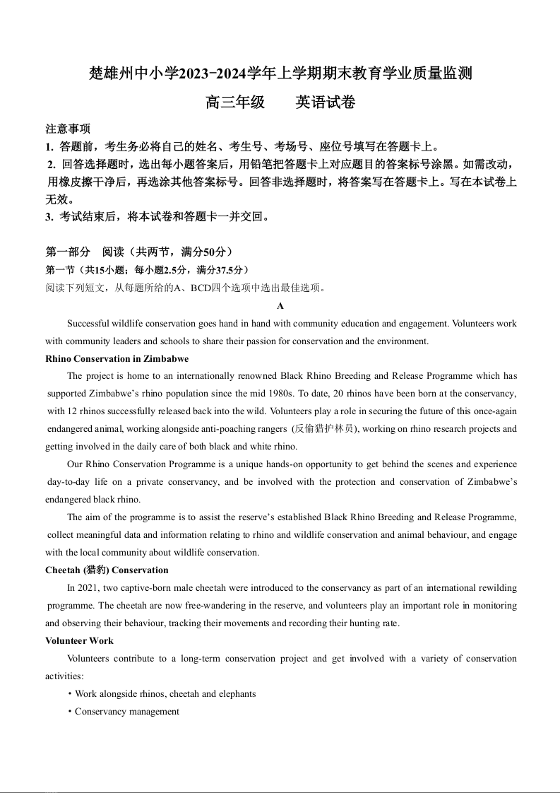 云南省楚雄彝族自治州2024届高三上学期1月期末英语+答案