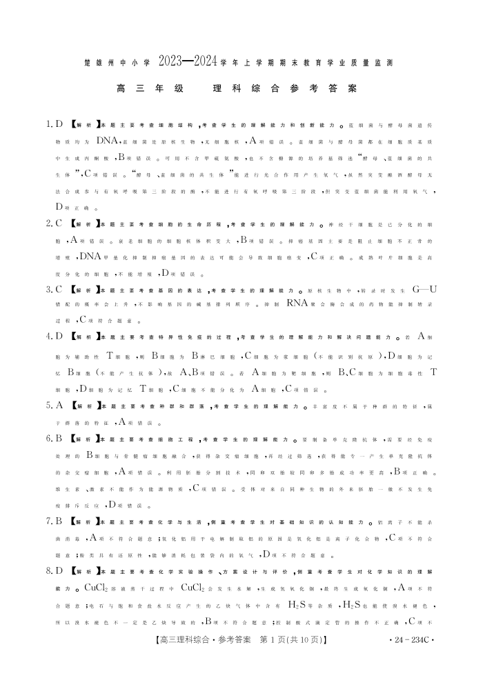 云南省楚雄彝族自治州2024届高三上学期1月期末理综答案