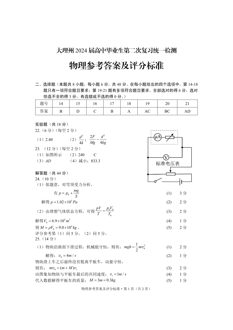 云南省大理州2024届高中毕业生第二次复习统一检测理科综合答案
