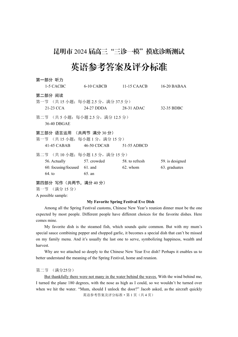 云南省昆明市2024届高三“三诊一模”摸底诊断测试英语答案