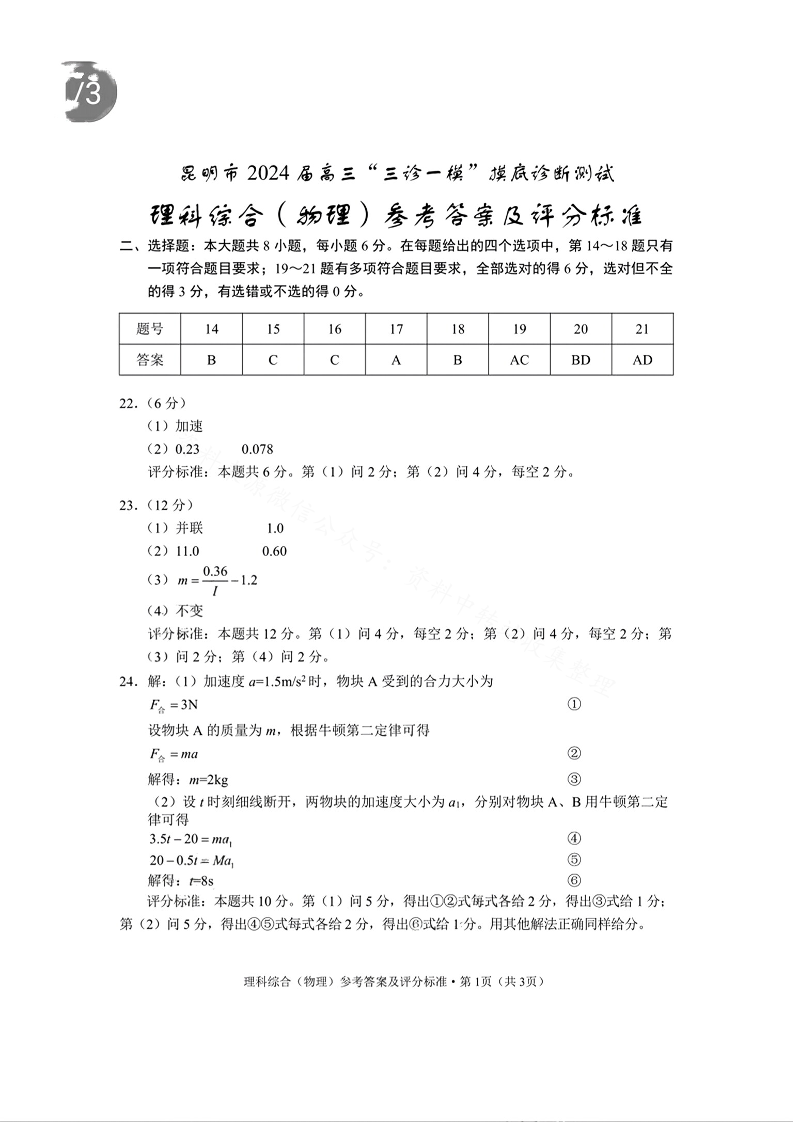 云南省昆明市2024届高三“三诊一模”摸底诊断测试物理答案