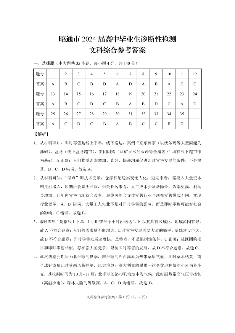 云南省昭通市2024届高三上学期诊断性检测文综答案