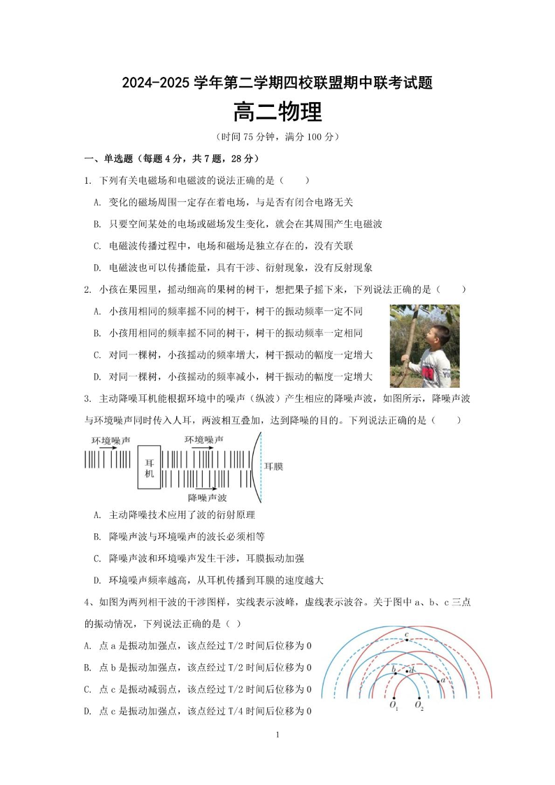 广东省清远市四校联盟2024-2025学年下学期高二期中联考物理+答案