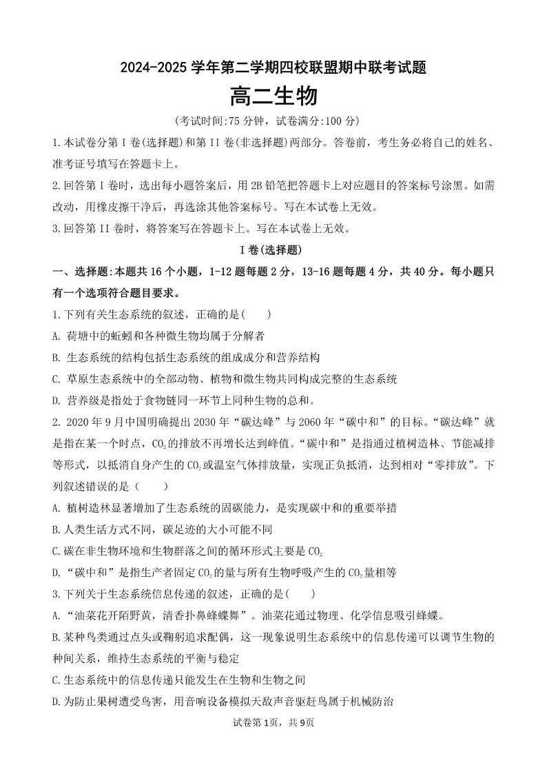 广东省清远市四校联盟2024-2025学年下学期高二期中联考生物+答案