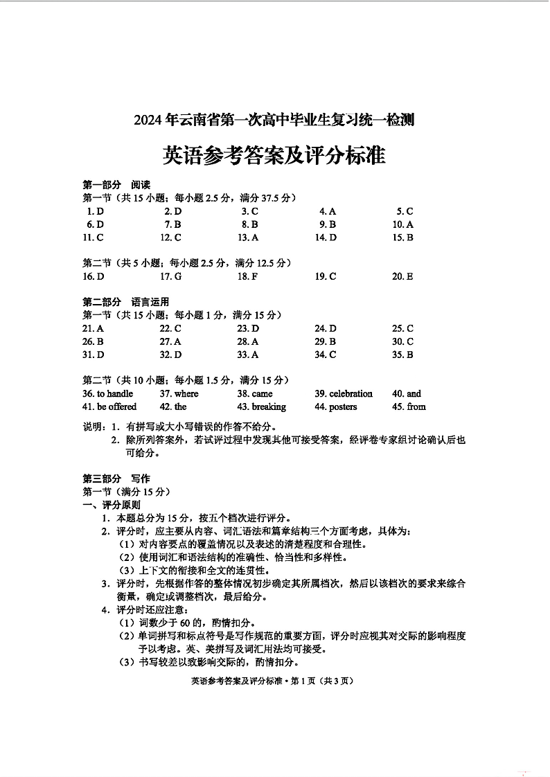 云南省2024年第一次高中毕业生复习统一检测英语答案