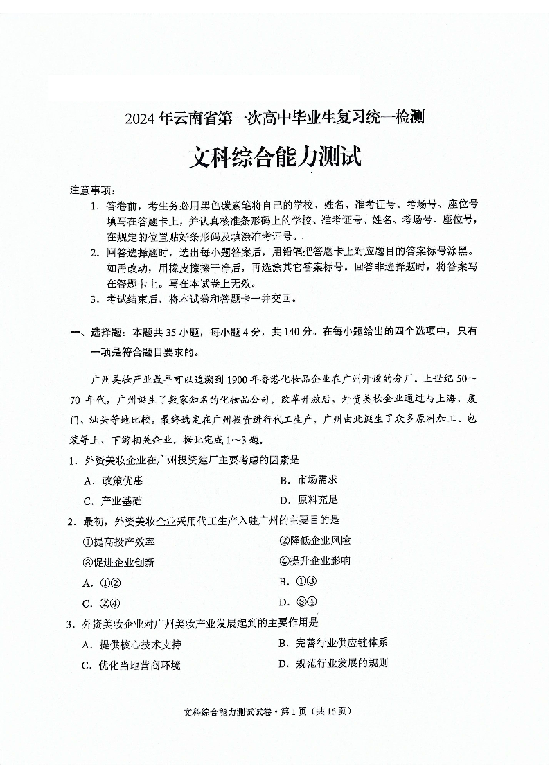 云南省2024年第一次高中毕业生复习统一检测文综