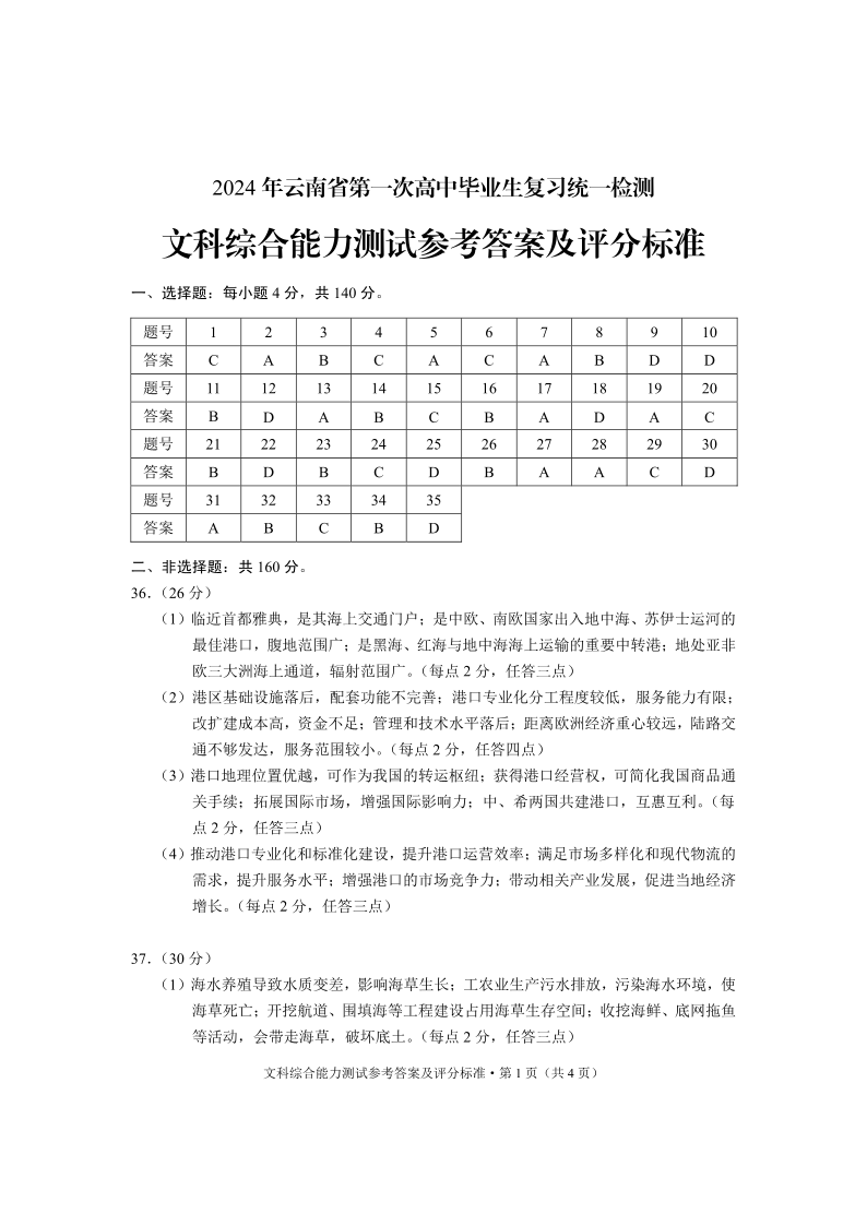 云南省2024年第一次高中毕业生复习统一检测文综答案