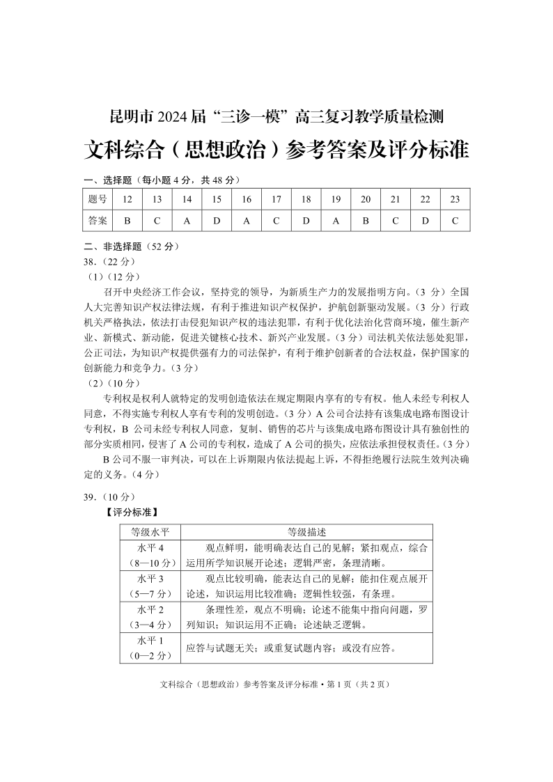 云南省昆明市2024届高三下学期“三诊一模”教学质量检测(二模)政治答案