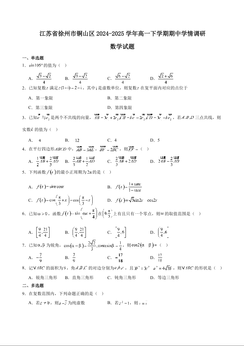 江苏省徐州市铜山区2024-2025学年下学期高一期中考试数学+答案